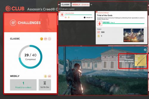 Сначала зайдите в свой аккаунт на сайте Ubisoft, а затем перейдите на вкладку еженедельных вызовов. Отыщите там кнопку, позволяющую забрать награду за убийство одного из богов. После этого снова войдите в игру и откройте инвентарь – в нем должен оказаться новый меч.