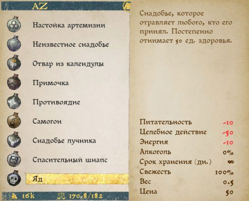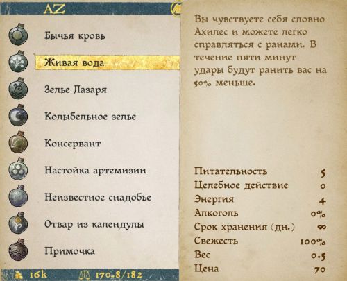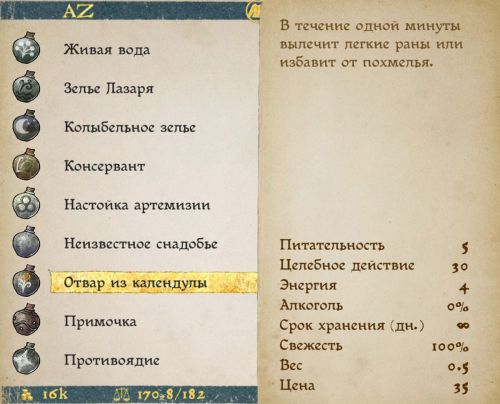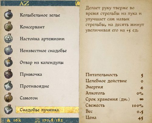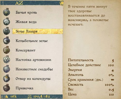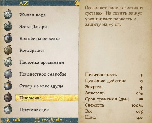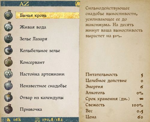 В игре можно выделить несколько снадобий, которые могут принести вашему персонажу максимальную пользу. Ниже мы указали их рецепты и воздействие на героя. Добавим, что в них нет спирта, поэтому вы можете употреблять их, не опасаясь стать алкоголиком.