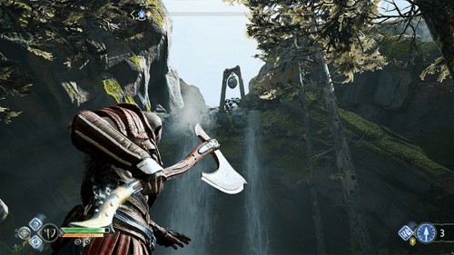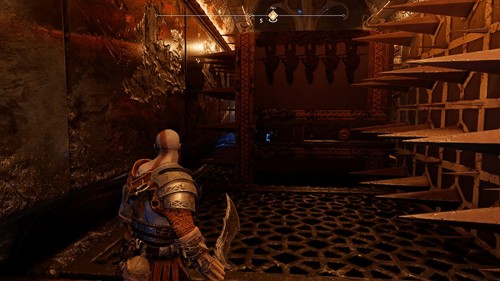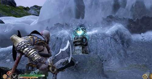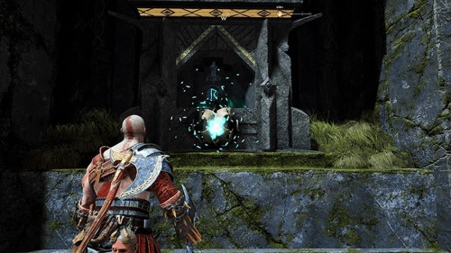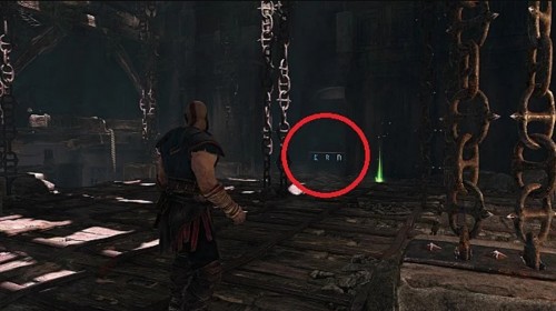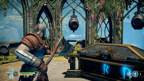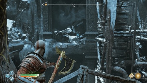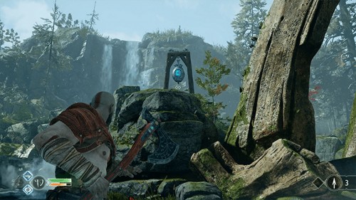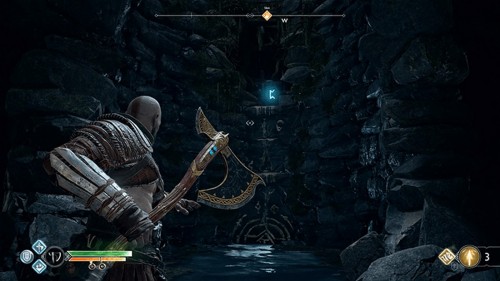 - Третья руна: Со 2-й печати снова поверните налево и обратите внимание на голубые всплески позади балки. Поднимите платформу, на которой вы находитесь, чтобы лучше разглядеть руну, а потом бросьте в нее топор.