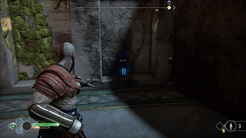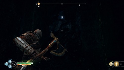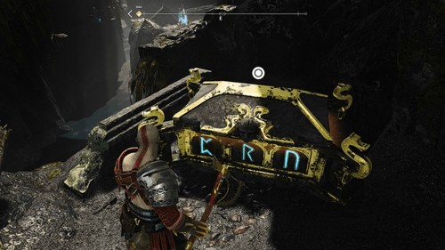 - Первая руна: Когда вы пройдите в нишу, первая печать тут же появится справа от вас – по другую сторону лестницы. Бросьте в нее свой топор, чтобы сломать.