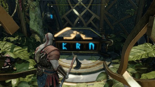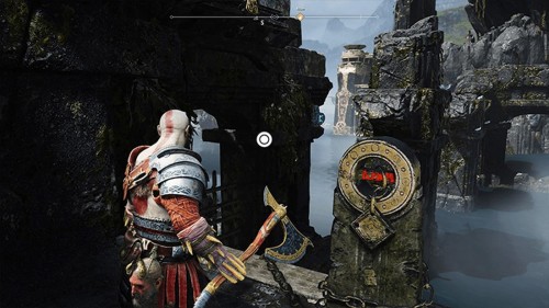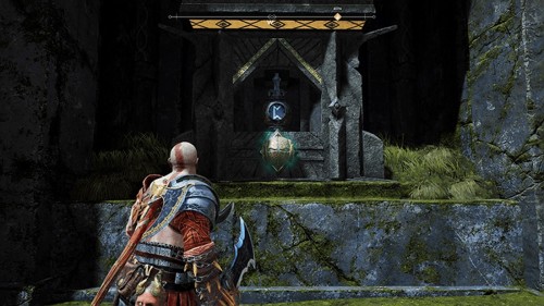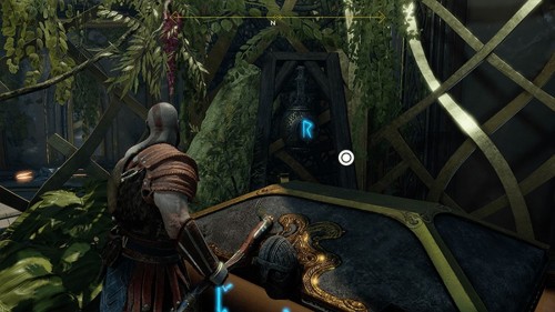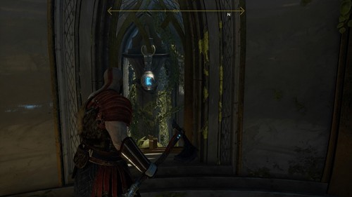 Когда Атрей получит возможность строить мосты из света, вы сможете вернуться к главным дверям храма. Однако пока не проходите через них! Вместо этого повернитесь и поместите кристалл в специальную ячейку, расположенную под укрытием.