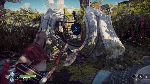 - Третий столб: Поверните направо и идите по тропинке возле упавшего дерева. Столбик будет окружена ядовитым туманом. Бросьтесь свой топор в туман, чтобы раскрыть руны. Его нужно будет повернуть так, чтобы он показывал символ в виде обратной буквы «B».