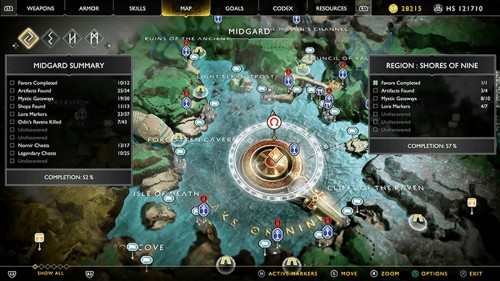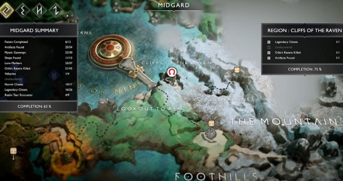 После снижения уровня воды в Озере Девяти вам откроется еще одна новая область. Причальте к новой локации на Скалах Ворона. Пройдите по тропинке вперед и вскоре вы доберетесь до сундука Норн. Для уничтожения печати вам нужно будет избавиться от всех растений и воспользоваться Ветрами Хель, чтобы выбрать правильные руны.