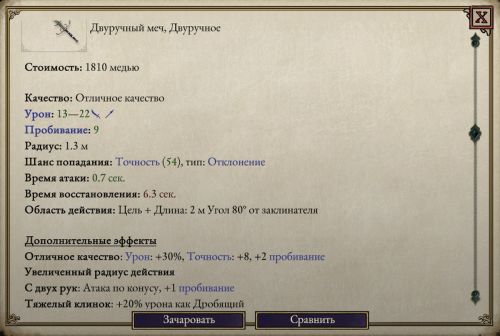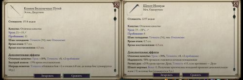 Выше показаны характеристики обоих мечей по отдельности, а также параметры двуручного оружия, получаемого при объединении этих клинков.
