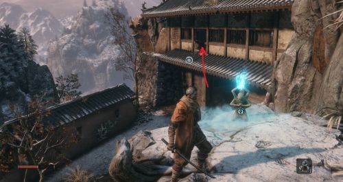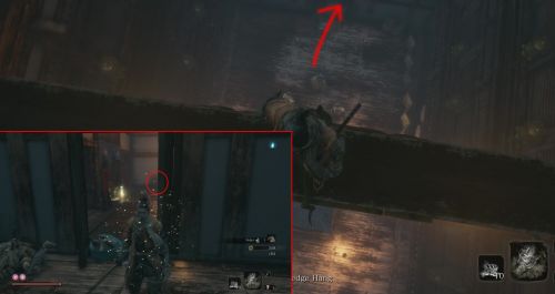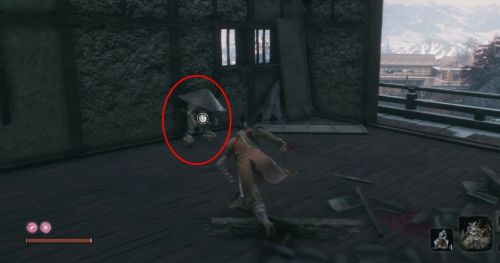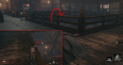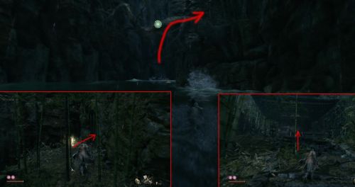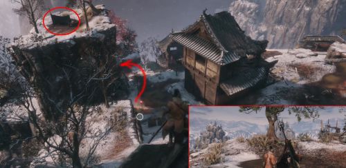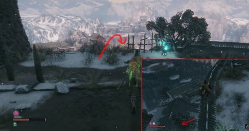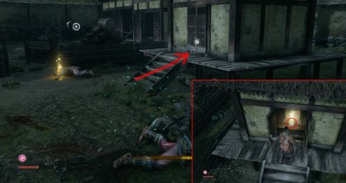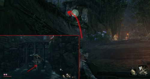 Переместитесь к идолу Резчика под названием «Бамбуковая роща на склоне», который находится в Поместье Хирата. Вы найдете его после сражения с Энсиной Мисеной. Поднимитесь по тропинке и сразу же схватитесь крюком за пень наверху и влево.