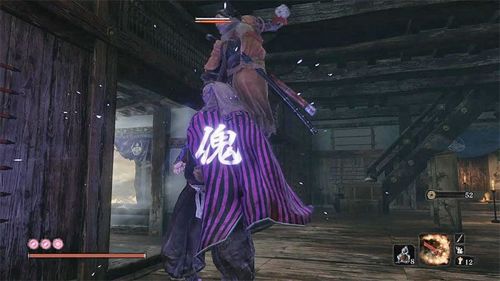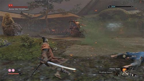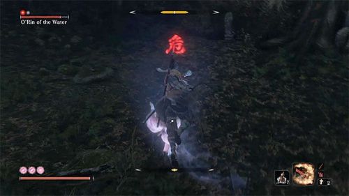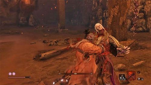 В этой битве вам нужно лишь блокировать удары врага и контратаковать его, то есть никаких закрученных тактик применять не придется. Впрочем, пригоршня пепла могла бы оказаться весьма кстати в этом бою. Помимо разрезающих атак босс может использовать колющие удары, которые отмечены красным иероглифом. Тут же уклонитесь от атаки, так как парировать ее невозможно.