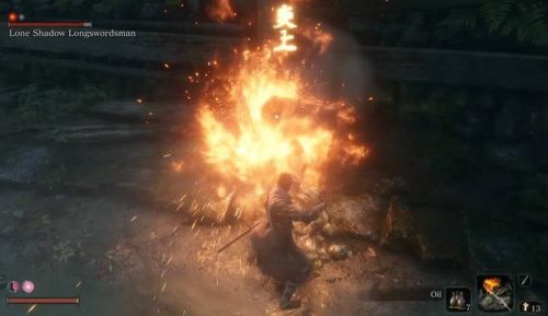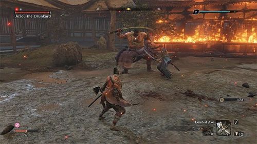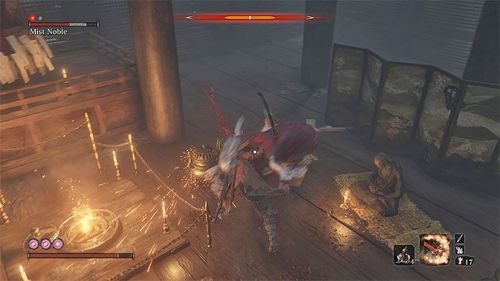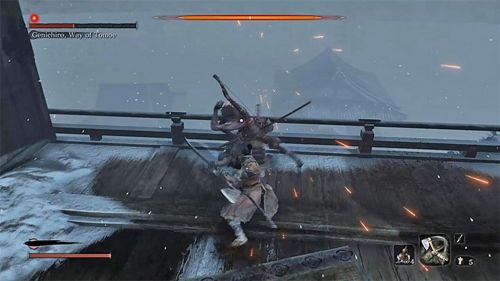 Далее начните использовать петарды и пригоршни пепла. Примените протез для оглушения врага, а потом ударьте его при помощи «Двойной Итимондзи». Данный комбо-удар сможет быстро лишить противника защиты. Как только его концентрация станет нестабильной, осуществите смертельную атаку.