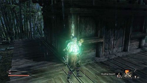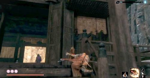 Идя по основной дороге к поместью, вы, в конце концов, дойдете до моста, который будет охраняться двумя разбойниками со щитами. Разберитесь с ними, воспользовавшись специальным протезом, и пройдите вперед. Охотник на синоби находится прямо за мостом. Его будут охранять четыре бандита: