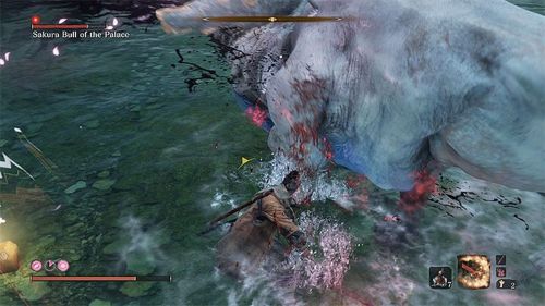 Сражение с бычком начнется практически сразу же после вашей победой над Гебу Онивой. Сначала разберитесь с противниками, которые сторожат лесенку, ведущую в замок и начинающуюся с идола. Потом воспользуйтесь ею и вступите в схватку с мини-боссом.