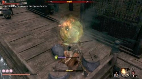 Для начала разберитесь со всеми рядовыми противниками, с которыми вы столкнетесь на пути к боссу. Затем дайте Масанаге заметить вас и направляйтесь к мостику. Копьеносец практически всегда застревает на лесенке. Увидев, что он не может двигаться, подойдите к нему сзади и начните бить его. В результате он освободится, и вы сможете продолжить бежать к мосту.