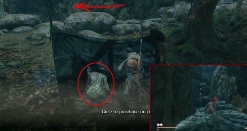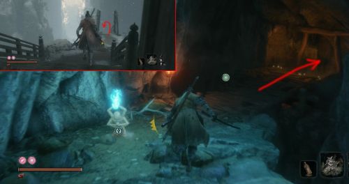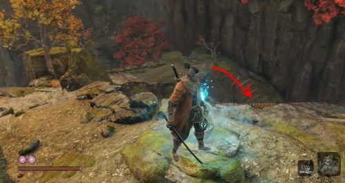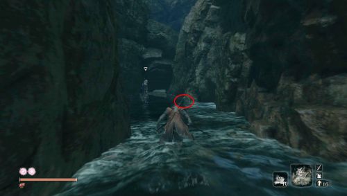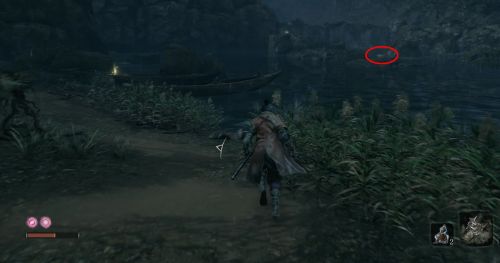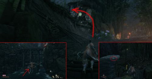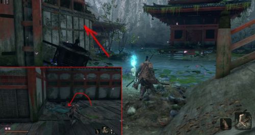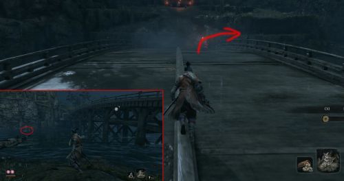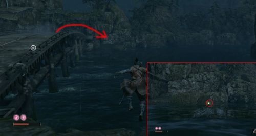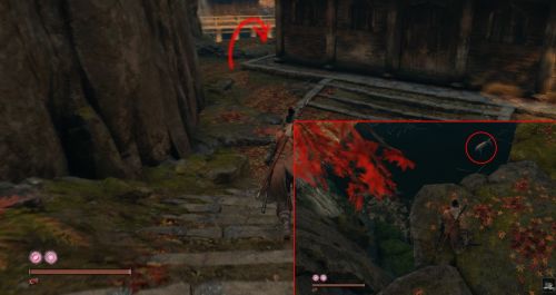 Вернитесь к мосту и снова пересеките его. Спрыгните направо, как только вы окажетесь на другой стороне, и найдите предмет на пляже, рядом с большой скалой. Это драгоценная чешуя, для получения которой вам не нужно сначала убивать рыбу. Следующая находится возле идола «Бамбуковая роща на склоне». Добравшись до идола, взберитесь на стену слева, используя крюк. Прыгайте в воду и проплывите под мостом. Карп находится возле водопада, и вы сможете использовать уступ, чтобы незаметно подкрасться к нему. Еще один скрывается под водой – вам придется нырнуть в водоем, чтобы достать его.
