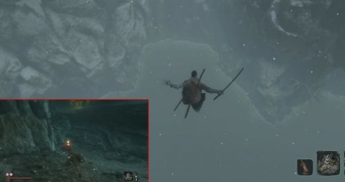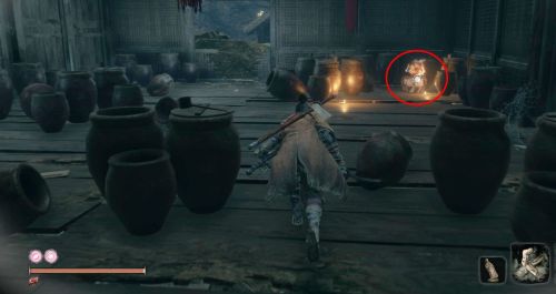 Затем переместитесь к идолу «Крепость» и спуститесь по лестнице мимо места, где вы сражались с длиннорукой-многоножкой Жирафом. Откройте дверь и спрыгните с разрушенного моста в пруд. Вы найдете две чешуи, убив двух карпов, и еще одну в виде предмета на дне озера возле идола пещеры.