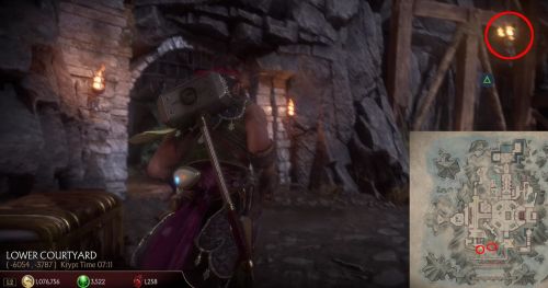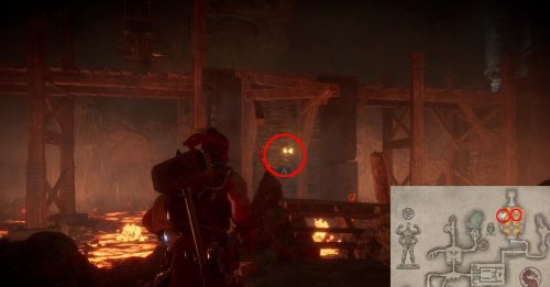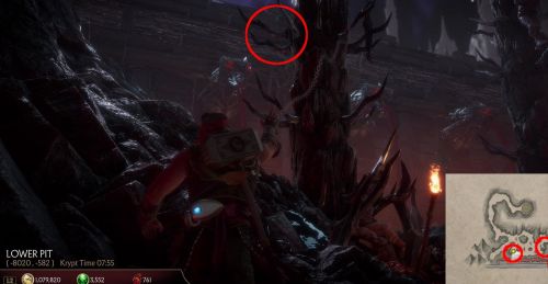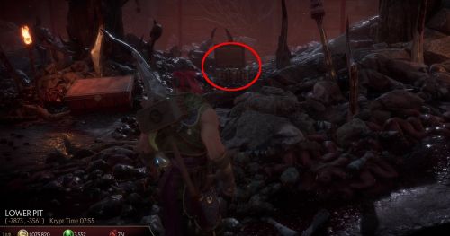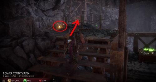 Он расположен в Нижнем дворе (-6581, -5106) в конце деревянной дорожки, с который открывается вид на Нижнюю яму. Отсюда можно также увидеть череп, который находится на террасе вдалеке. Чтобы добраться до него, сначала необходимо будет решить головоломку с колесом в Улье Киттинов.