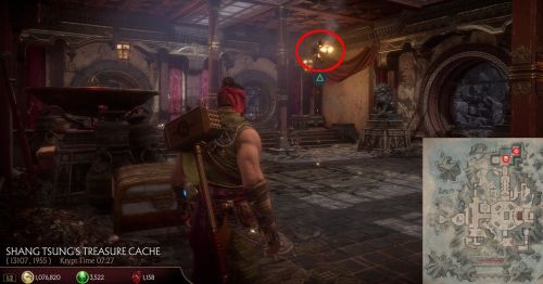 Они не разделены по персонажам, но с них все равно выпадают заранее заданные предметы. Чтобы открыть их, сначала нужно использовать Копье Скорпиона и вытащить тем самым пылающий череп, а затем заплатить 100 сердец. Черепа не всегда находятся рядом с сундуками, поэтому на первом скриншоте мы будем показывать расположение сундучка, а на втором - черепа.