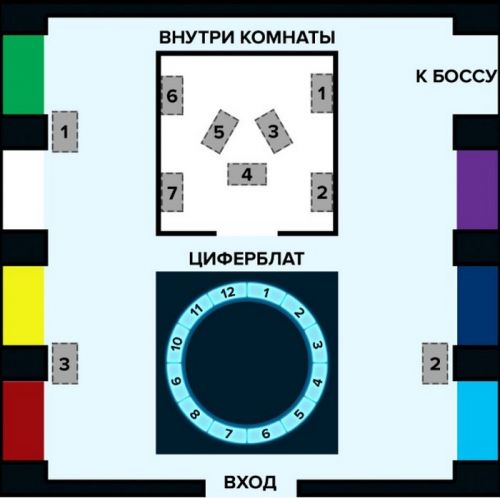 Если коротко, то в зале расположено 8 комнат. Только одна из них позволяет продолжить выполнение квеста «Час испытания» – та, которая имеет отверстие в полу, однако она никак не связана с нужным контрактом. Здесь также расположены 3 консоли, но использовать нужно будет только две из них, которые игроки называют Консоль 1 и Консоль 2.