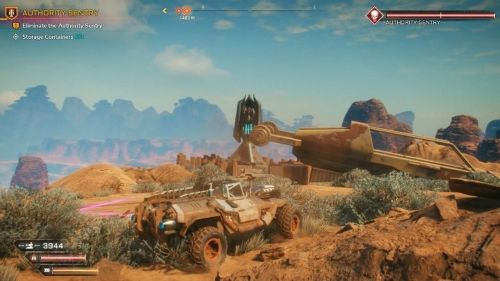 Уничтожьте турель, стреляя в ее центр из оружия, установленного на вашем транспортном средстве. Когда он начнет стрелять в вас, спрячьтесь за скалами справа.