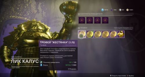 Второй способ получить трофеи – это купить их прямо у статуи Калуса. Однако вам придется заплатить за них огромные суммы из осколков сумерсвета, блеска, легендарных осколков и других ценных материалов. Впрочем, завершая еженедельные контракты, вы можете получить скидку в размере до 80 процентов, но на это уйдет много времени.