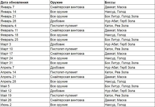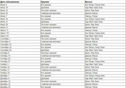 Каждую неделю происходит обновление боссов и 3-х типов оружия (иногда может выпасть оружие любого вида) в эскалационном протоколе. Полный цикл длится 5 недель, а потому если вам требуется дробовик ИКЕЛ, то вы должны быть точно уверены в том, что начали проходить задание в нужный момент времени.