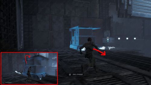Когда вы войдете в нужную комнату, расположенную на верхушке звездного разрушителя, вы увидите консоль с левой стороны, тележку, которую можно перемещать по рельсам с помощью «Толчка» и «Притяжения», а также несколько вертикальных платформ, позволяющих перебегать с одной стены на другую. Когда вы взаимодействуете с консолью, платформы встанут в горизонтальное положение, а грузовой лифт вдалеке начнет подниматься.