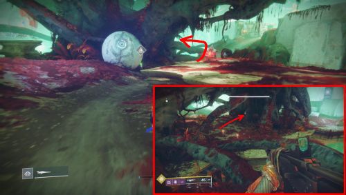 Приземлитесь в «Могиле смотрителя» и следуйте по дороге к «Узлу». Дойдя до развилки, держитесь левой стороны. Пройдите мимо большого каменного шара и прыгните на корни слева. Вам нужно пройти под гигантским деревом – куб парит в корнях.