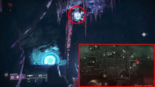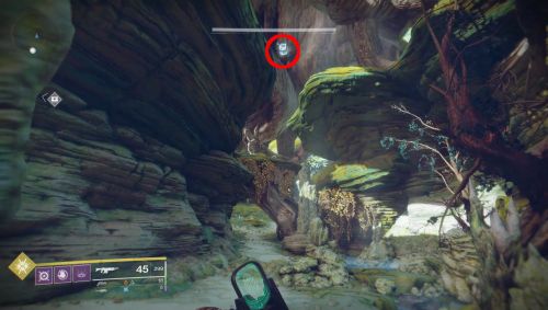 Появитесь в нужной локации, а затем пройдите за утес справа от вас. Войдите в пещеру и следуйте по ней до комнаты с порталом, идя по пути, ведущему в Небесную палату. Спрыгните, будучи окруженным врагами, и посмотрите наверх – вы увидите куб у потолка.