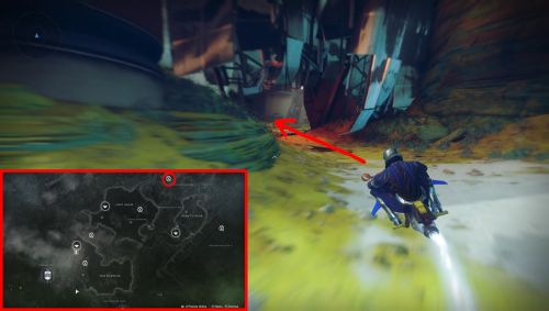 Приземлитесь в «Резервуаре», а затем идите к «Пойме отражений». Спускаясь вниз по склону, постоянно смотрите налево – через некоторое время вы увидите лачугу, построенную из листового металла. Зайдите внутрь и посмотрите влево – куб будет парить у двери.