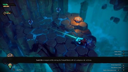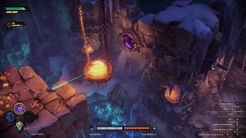 Пройдя дальше, вы увидите глубокую пропасть перед собой. Ударьте по синей кнопке внизу стрижающим мечом для создания воздушного потока. Далее вам предстоит кинуть клинок таким образом, чтобы он сначала пролетел над огнем, а потом попал в кристаллы. Это позволит вам открыть последний участок области и завершить 1-ю главу.
