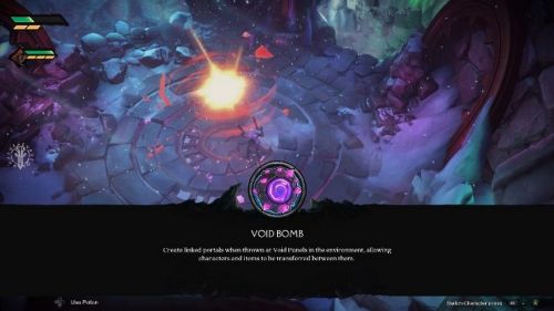 Вам нужно будет кинуть Пустотную бомбу в первый фиолетовый символ для создания разрыва в пространстве. Потом откройте второй портал прямо за пропастью. В результате у вас получится проход, который даст вам возможность попасть на другую часть области.