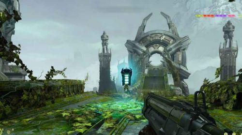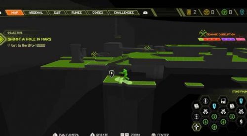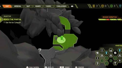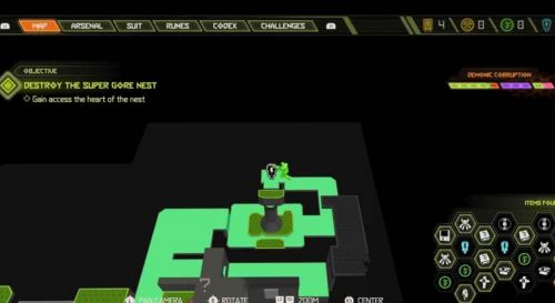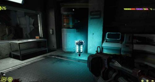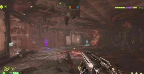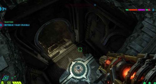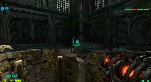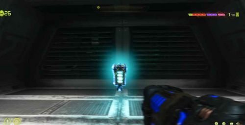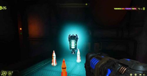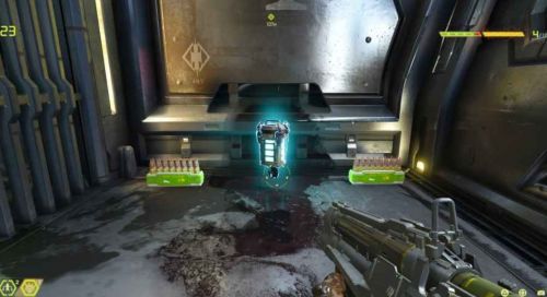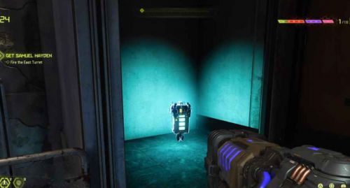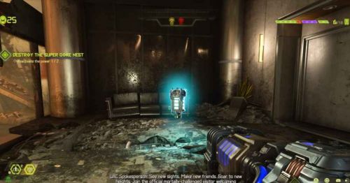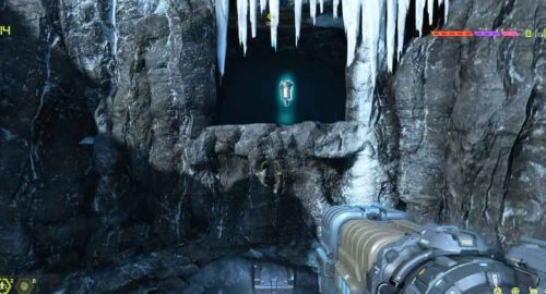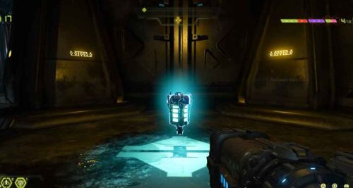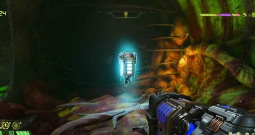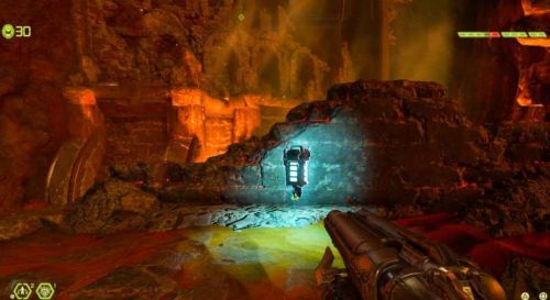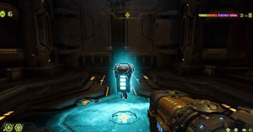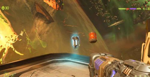 Поднявшись на вершину лифта и сразившись с несколькими демонами, пройдите налево и войдите в другой подъемник, когда он будет опускаться. Затем выйдите из него, как только он поднимется. Спрыгните, чтобы найти батарею.