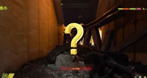 В следующем столкновении с врагом в локации, показанной на карте ниже, вы увидите магазин прямо впереди, над проходом в который будет написано слово «Scott». Проигнорируйте этот вход и пройдите налево, чтобы увидеть неоновую вывеску «ShuZ» (здесь солдат выстрелит в импа). Далее выполните двойной прыжок, чтобы взобраться на выступ над вывеской. Слева расположена потрескавшаяся стена, которую вы можете уничтожить для нахождения секрета.