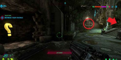 Добравшись до зоны, показанной на скриншоте ниже, и найдя руну, спуститесь по спирали, но НЕ спрыгивайте сразу вниз – вместо этого пройдите в небольшую нишу у основания лестницы, где находился солдат, и прорвитесь через стену с трещинами, чтобы найти данный секрет.