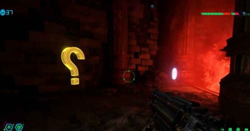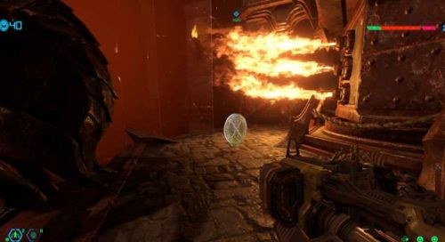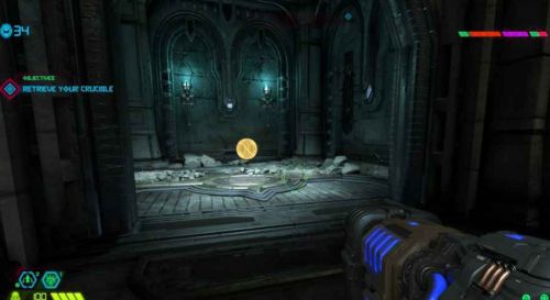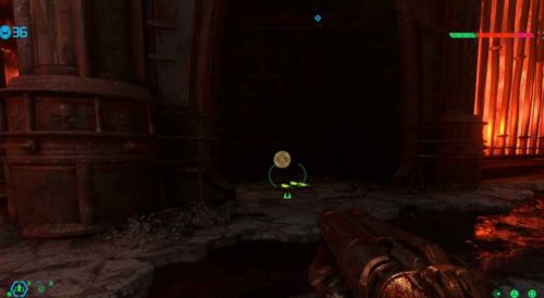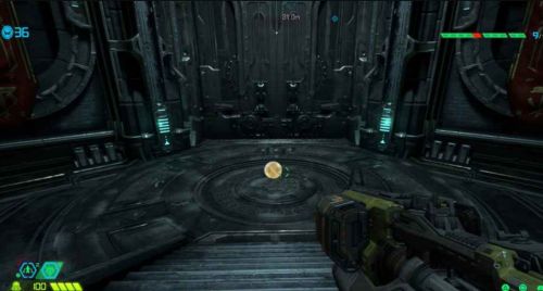 Он расположен в первом помещении, где вам нужно выстрелить в кнопку, чтобы убрать силовое поле. Развернитесь после совершения прыжка и найдите кнопку на потолке. Выстрелите в нее, дабы платформа начала двигаться вверх и вниз. Заберитесь на нее и поднимитесь на стену. Потом пройдите вперед для нахождения этого предмета.