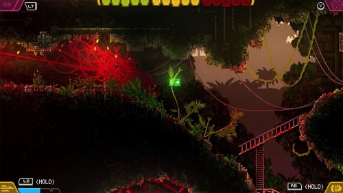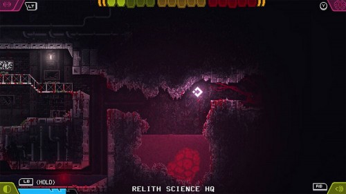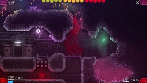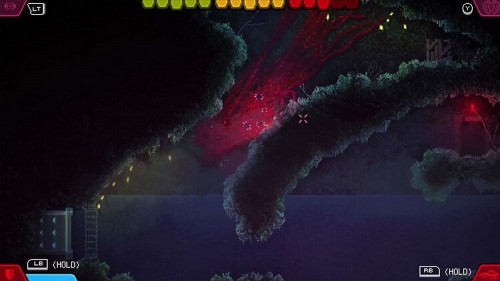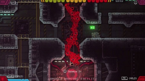 Справа вы увидите ракетницу, а слева – выход. Вы можете повернуть налево и немного подзарядиться. В ином случае идите направо и используйте щит, чтобы защитить себя от снарядов. В пруду в углу сбросьте биомассу, пока не станете 1-уровневым монстром и спуститесь в следующую комнату.