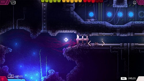 В локации с автоматическим пулеметом сверните к выходу, расположенному справа и наверху. В следующей комнате будет небольшой водоем и точка сохранения, спрятанная в углу. Ниже вы увидите небольшую трубу, которая заблокирована. Используйте удар, чтобы убрать преграду и проползите внутрь.