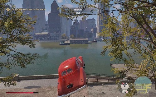 Мы рекомендуем начать с автомобиля, обозначенного цифрой 1 на картинке выше – он находится дальше всех от точки старта. Если вы допустите ошибку в начальной части миссии, то сможете сразу же ее перезапустить. На изображении также выделена рекомендуемая зона для топления автомобилей – это набережная в районе Downtown.