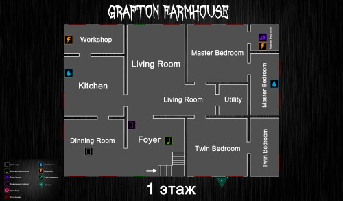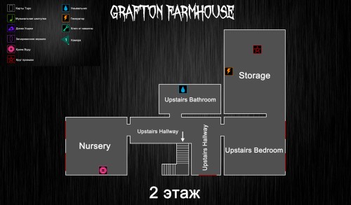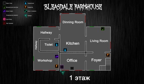 Названия комнат были получены благодаря звуковому датчику. Если поместить один из них в помещение, то его наименование будет указано в грузовике. При использовании досок Уиджи, позволяющих узнать расположение призраков, указываются именно эти названия. Поэтому они не были переведены на русский язык. Добавим, что карты были созданы пользователем Steam под ником enot3ds.
