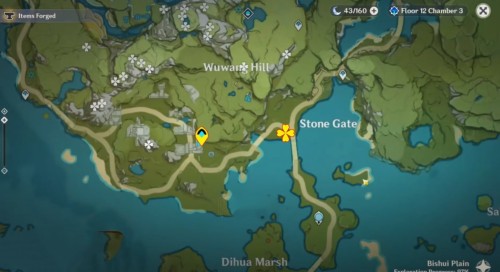 От данжа «Скрытый дворец Уван» спуститесь под гору на юго-востоке – здесь находится первый цветок.
