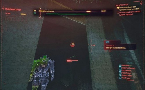 Просмотрев ролик, сбросьте его, чтобы начать анализ. Приостановите видео, как только дверь лифта откроется и появится Адам Смэшер. Просканируйте камеру датчика движения с правой стороны – вы должны находиться в визуальном слое. Это одно из устройств, связанных со второй необязательной задачей этого процесса (сканирование всех систем безопасности квартиры).