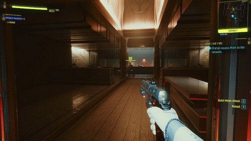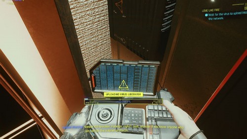Войдите в серверную и подключите Альт Каннингем к системе. ИИ легко взломает защиту и расчистит путь к Микоши. Поднимитесь к лифту на нижнем этаже и спуститесь в холл нетраннеров. Как только выйдете из лифта, идите прямо к Микоши.