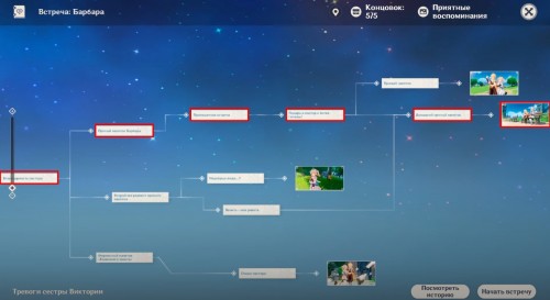 Отметим, что вам не нужно проходить квест с самого начала для открытия всех финалов, так как в меню «Встреча: Барбара» можно легко выбрать необходимый ключевой момент и попробовать продвинуться по другому пути.