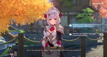 Разобравшись со всеми хиличурлами в отмеченной локации, снова поболтайте со спутницей и скажите ей следующее: