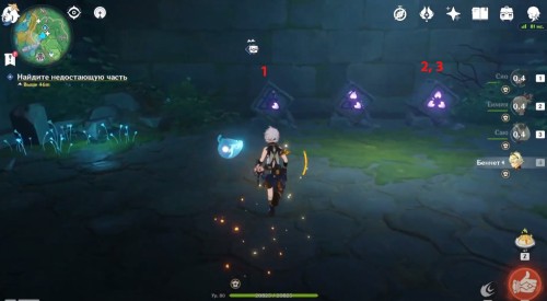 Там вы обнаружите Электро поле, через которое сможете запросто пролететь при наличии электрогранума. Затем взаимодействуйте с кубом-консолью, чтобы убрать воду. Спуститесь вниз по лесенке и разберитесь с тремя руинными защитниками. Затем ударяйте по кубам, пока на всех них не загорится один и тот же символ (то есть на всех кубах, к примеру, должны гореть два лепестка). Хотя, вы, скорее всего, разгадаете эту загадку автоматически при сражении с противниками. На скриншотах ниже показан наш вариант решения головоломки. Цифрами указана последовательность ударов.
