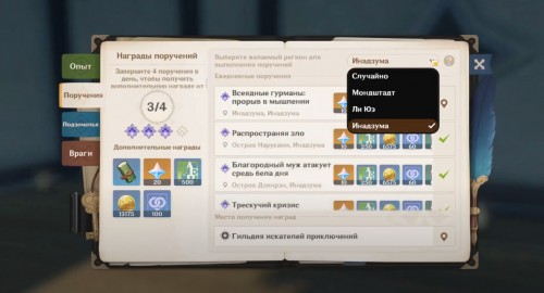 Впрочем, вы можете повысить шанс получения необходимой миссии, открыв справочник искателя приключений, перейдя на нужную вкладку и выбрав Инадзуму в графе «желаемый регион». Когда вам выпадет необходимое задание, просто поговорите с Нэко в храме.