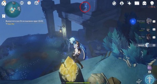 Спланируйте вниз на необходимый островок и пройдите через каменный проход к постройке с запертой решеткой. Четыре огня, которые вы выпустите, соберутся как раз таки рядом с этим сооружением.