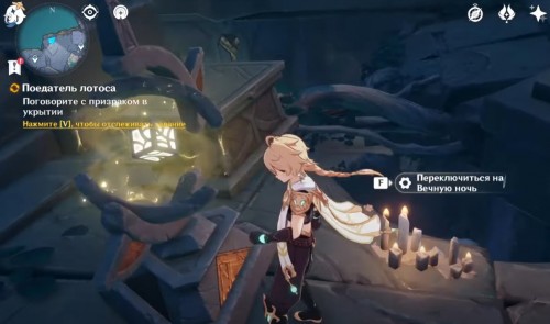 Затем снова переключитесь на Вечную ночь. Спрыгните вниз в отверстие на полу и поднимитесь по каменной лесенке. Далее поговорите с призраком в укрытии. Во время разговора необходимо выбрать вторую фразу: «После заката наступает тьма…»