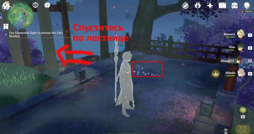 Начните спускаться вниз по длинной каменной лестнице. Затем спрыгните с лестничного пролета и спланируйте на островок с ветвью громовой сакуры. Призовите электрогранум и поднимитесь вверх с помощью громовых сфер. Далее спуститесь вниз, пока не начнется кат-сцена.