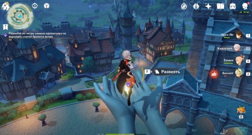 Теперь вернитесь к Глории и передайте ей семена. Затем она попросит вас развеять их на верхушке статуи Архонта ветра, стоящей на площади города. Встаньте на ладони и взаимодействуйте со светящимся маркером.