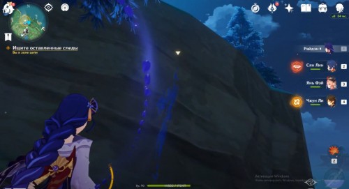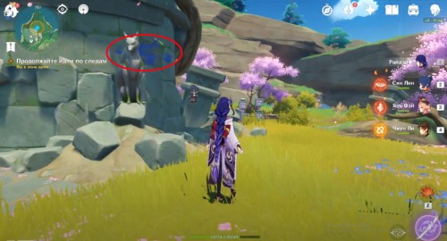 Вам снова предстоит искать фиолетовые пятна на земле, камнях и стенах. Первый след находится возле статуи кицунэ. Пройдите к головоломке с кубами впереди, и вы увидите новое пятно справа от нее. Пробегите еще немного дальше – лиловый след будет на выступе.