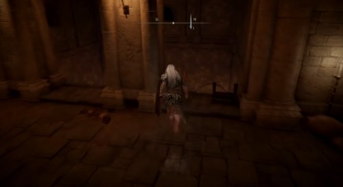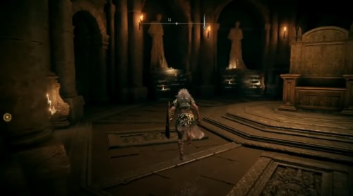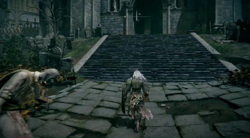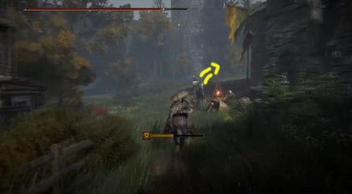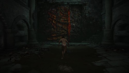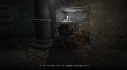 Пройдите вперед по прямой дороге. Далее начните прыгать по балкам, которые торчат из стен, чтобы спуститься вниз. Там внизу вы обнаружите «костер» Проскрипция Яростного пламени. Неподалеку будет стоять Хейтта. Она скажет вам снять с себя все вещи, а потом пройти через каменные врата впереди.