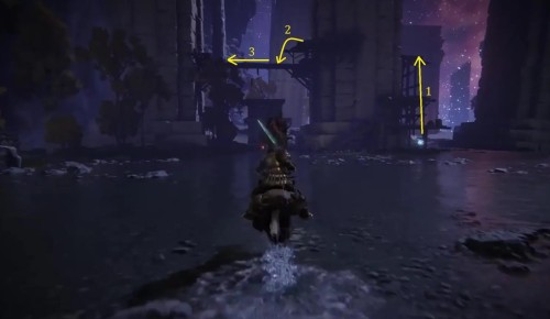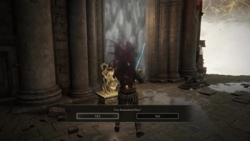 Продолжайте двигаться на север. В конце дороги взберитесь наверх по винтовой лесенке справа. Потом вы увидите впереди проход, для открытия которого требуется мечевидный ключ. Используйте его и пройдите внутрь. Там вы обнаружите место благодати «Подъемник драконьего храма».